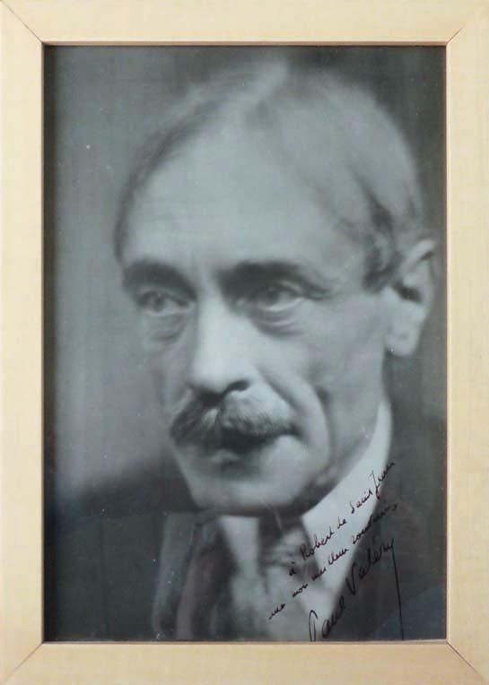 Photographie originale in-8, avec envoi autographe signée « à Robert de Saint Jean – avec mon meilleur souvenir – Paul Valéry ». Très beau portrait de trois quarts vers 1930. Encadré (24 x 17 cm).
