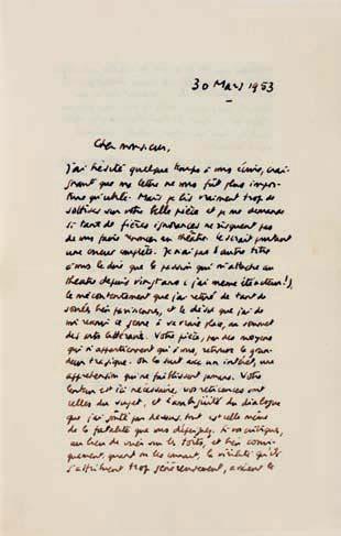 Camus encourage chaudement Green à continuer d’écrire pour le théâtre. Trop de sottises ayant été écrites sur Sud (pièce donnée au Théâtre de l’Athénée à Paris en 1953), « … je me demande si tant de fières ignorances ne risquent pas de vous faire renoncer au théâtre. Ce serait pourtant une erreur complète… ». Son désir est de voir revenir « … ce genre à sa vraie place, au sommet des arts littéraire. Votre pièce, par des moyens qui n’appartiennent qu’ à vous, retrouve la grandeur tragique... vos réticences sont celles du sujet, et l’ambiguïté du dialogue que j’ai goûté par-dessus tout est celle même de la fatalité que vous dépeignez. Si vos critiques au lieu de crier sur les toits, et bien comiquement… avaient le moindre sens de ce qu’est la création artistique, ils eussent exalté cela… Notre théâtre, soyez en sûr, n’a pas besoin de fabricants. Il en a, et à revendre… Il a besoin de créateurs et d’ écrivains comme vous qui lui rendent enfin sa noblesse… ». Et plus bas, en post-scriptum : « Ne répondez pas à cette lettre, je vous prie. J’ai eu du plaisir à l’ écrire – et je sais le poids du courrier et le prix de votre temps ».