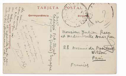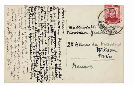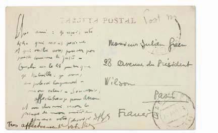 Six lignes amicales à Anne et JulienGreen (au dos d’une carte illustrée d’une vue panoramique de Cadaqués), précédées d’une dizaine de la main de Gala, qui a également écrit l’adresse. « … Qu’el domage de ne pas vous avoir pour racontai les milles chosses amusantes et cocasses de notre voyage, ici cet plus idilique que avec un ciel dur et sans nuages depuis votre arribe ! ... », etc. Gala, quant à elle, dit avoir regretté de ne pas avoir réussi à voir Julien et sa sœur : « … nous aurons plus de choses à vous montrer… Nous avons été très très contents qu’Edmond Jaloux semblait vraiment aimer son tableau. J’espère que Julien va mieux… à bientôt… ».