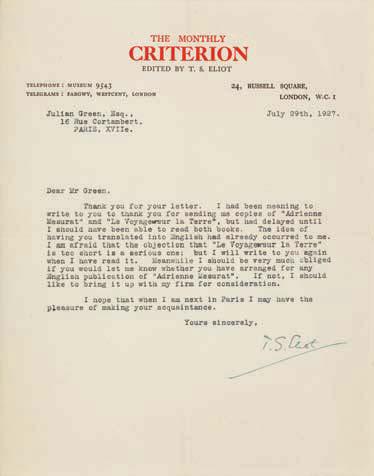 Il a reçu Adrienne Mesurat et Le Voyageur sur la Terre , « … but had delayed until I should have been able to read both books. The idea of having you translated into English has already occured to me. I am afraid that the objection that Le Voyageur sur la Terre is too short is a serious one ; but I will write to you again… Meanwhile I should be very much obliged if you would let me know whether you have arranged for any English publication of Adrienne Mesurat. If not, I should like to bring it up… », etc. Un mois plus tard, Eliot informe Green qu’il a adoré Le Voyageur sur la Terre « … but I wish you could produce three or four more of the same type to make a volume... as you have not yet had anything published in England… it would be better to bring out a novel first… ». Il a su par Harper qu’une maison d’édition anglaise envisage de publier Adrienne Mesurat ; il se tient néanmoins prêt à reprendre l’affaire. « … In any case, I hope that you will keep my firm in mind for your future books… ».