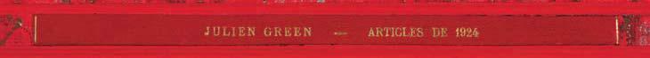 Manuscrits autographes ou tapuscrits, environ 60 pages, formats divers. Quelques imprimés joints. Le tout conservé dans une chemise recouverte de papier marbré. Pièce de titre en veau rouge (« Julien Green – Articles de 1924 »). Etui assorti.