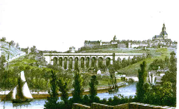La ville de Dinan est située à 60 mètres au-dessus de la rive gauche de la Rance. Elle a un port qui communique au moyen du flux avec celui de Saint-Malo, et dans lequel peuvent entrer à marée haute des navires de 80 à 100 tonneaux. Vue de loin, elle apparaît au voyageur qui arrive de Saint-Malo par la Rance comme une imposante citée placée au milieu des nuages. La situation de la ville entouré de fossés profonds et de murailles de granit, bordées de créneaux et de machicoulis, de tours de largeur prodigieuses, ayant à leur sommet des plates formes environnées de parapet crénelé en faisait au moyen-âge une place de guerre presque inabordable. ( Les Côtes du Nord, par Benjamin Jollivet. 1854 ). La première impression de Dinan, est de Julien Aubinière, en 1593. Véhémente apologie de la Ligue, ce livre de 289 feuillets, dû à Nicolas de Langelier évêque de Saint-Brieuc. |