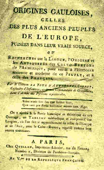 Recherche sur la langue, l'origine et les antiquités des celto-bretons de l'Armorique, par Théophile-Malo CORRET de La TOUR d'AUVERGNE, premier grenadier des armées françaises , né à Carhaix (Finistère), le 23 octobre 1743. Mort au combat le 28 juin 1800. En 1793, il en comptait quarante cinq de service, dont trente trois d'effectifs. S'étant déclaré pour la révolution, il servit d'abord à l'armée des Pyrénées orientales, où il commandait toutes les compagnies de grenadiers formant l'avant garde, et appelées colonne infernale. Ses loisirs étaient consacrés à la méditations, et l'on trouvait toujours un livre à ses côté. L'étude de la langue celtique l'occupa toute sa vie. En 1792, il fit paraître ses nouvelles Recherches sur la langue, l'origine et les antiquités des Bretons, pour servir à l'histoire de ce peuple ; avec un exellent Glossaire breton-polyglotte. Imprimé à Bayonne, chez Pierre Fauvet le jeune. Cet ouvrage reparu, en 1797, imprimé à Paris, chez Quillau, an V. in.8°, 340 pages. Ces ouvrages sont de nos jours devenus de la plus grande rareté. |