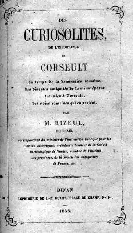 "Cette rare étude sur les curiosolites et de l'importance de la petite ville de Corseult (Côtes d'Armor)au temps de la domination Romaine ; et des divers antiquités de la même époque qui y furent trouvées nous est donnée par Louis Jacques Marie Bizeul, né le 14 septembre 1785, à Blain (Loire Atlantique). Notaire de cette ville, il succède à son père, dernier archiviste des Rohan. Versé dans l'histoire des institution et familles de l'ancienne France, il employait ses loisirs à l'étude des antiquités romaines, plus spécialement à celle des voies romaines. Ses nombreux écrits ou mémoires sont de nos jours toujours très recherchés. Bizeul, était membre de la Société Académique correspondant du Ministère. Fondateur, président honoraire de la Société Archéologique de Nantes. Il décéda à Blain, le 27 mars 1861. |