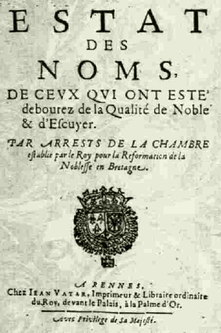 État de noms des nobles qui furent déboutés à la réformation ( 1669 ) de la noblesse en Bretagne. "A Rennes, chez Vatar, Imprimeur & Libraire ordinaire du Roy, devant le Palais, à la Palme d'Or. S.D. (1671), IN.4°,76 pp." |