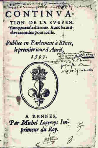 Articles accordés pour le pays et Duché de Bretagne, entre les députés à la conférence d'Ancenys, le 9 mars, de la part du Roi et le Duc de Mercoeur. En conséquence de la suspension d'armes faite à Angers le 24 janvier 1597. Publiée en Parlement à Rennes le 1 avril. Signé : Courriolle (Pierre Couriolle, greffier en chef civil, au Parlement de Bretagne depuis 1594). Belle et rare impression de Michel Logeroy (1589-1600). Il est probable que son installation à Rennes soit aux environs de 1589-90 ( Ropartz Étude sur les comptes des miseurs ). La production connue à Rennes entre 1589 et 1600 (année de sa mort) est de onze titres, d'après le répertoire bibliographique de Jacques Betz, et les arch. du Bibliophile Breton III (de la Borderie). L'exemplaire, ici inconnu, non répertorié en ferait le douzième : Format In.8°, de 8 pages n. ch. |