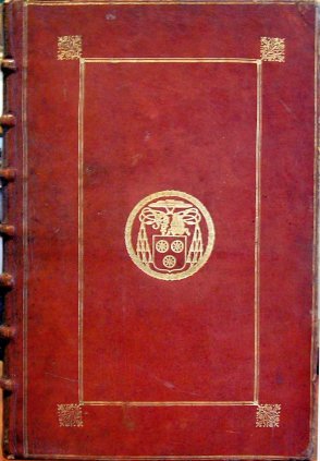 3.[AUGUSTIN] Octavus Tomus operum divi av. relii av Augustini Hipponensis Episcopi continens enarrationes in Psalmos Mysticos. Venetiis,Signum Spei,1550, in-4°, maroquin rouge double encadrement avec en son centre une frise de feuillages, celui intérieur avec des clous doré dans les angles, Armes au centre dans un encadrement de feuillages endadré par un oval d'un double filet doré se croisant pour former deux cercles en ses parties supérieure et inférieure, avec frappé en leur centres respectivemen "PIVS V" et "P.O.M.", dos richement orné, tranches dorées peintes de feuilles roses encadrant les Armes reprisent sur les tranches Aux Armes du Pape Pie V (1504-1572) Pie V (Saint), Pape de 1566 à 1572 exigea l'application des Décrets du Concile de Trente, dont il publia le Catéchisme (1566), il suscita la Sainte Ligue contre l'Empire Ottoman (Victoire de Lépante 1571) Tome 8 seul 1 000 Résultat : 1 900