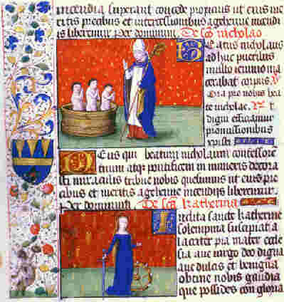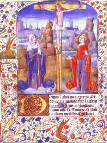 Heures de la Croix image pleine page Le Christ en croix, Marie & Jean. 31 verso - 33 Heures du Saint Esprit image pleine page La Pentecôte (à la colombe) 34 - 36 recto Les vii Psaumes de la Pénitence image pleine page Le roi David 36 verso - 40 Litanies lettrines formant bordure 41 - 43 in fine composition pleine page composition héraldique Office des morts image pleine page Absoute au cimetière 44 - 52 verso Oraisons diverses 52 verso - 62 o Oraison de Notre Dame tableau Vierge à l'Enfant o O intemerata tableau Piétà o Les xv joye nostre Dame tableau la Vierge Marie & Jésus enfant o Les vii requeste tableau la Sainte Trinité o Oraison de saint Sébastien tableau martyre de saint Sébastien o Oraison de saint Antoine tableau saint Antoine o Oraison de saint Nicolas tableau saint Nicolas o Oraison de sainte Katherine tableau sainte Katherine o Oraison de sainte Marguerite tableau sainte Marguerite o Oraison de sainte Barbe tableau sainte Barbe o Les vii versets de saint Bernard lettrine o Oraison dévote lettrine Illumination Gamme Ces Heures sont enluminées, à chaque page, par une ample gamme d'images, déclinées des plus imposantes aux plus discrètes : -images pleine page, bordées de marges fleuries; -tableaux quart-de-page; -marges fleuries : motifs floraux (roses, bleuets, coquelicots, pensées, pâquerettes, illets, chardons, fraises &c.), animaux (singes, escargot), oiseaux (paon), créatures fantastiques et anthropozoomorphiques, personnages (flutiste, cornemuseux), monstres, armoiries; -lettrines : grandes (à 4 lignes), moyennes (à 2 lignes) et petites (à 1 ligne); -bouts-de-lignes. Total Ce livre présente un total de 11 (sur 12 originelles) images pleine page à toutes marges fleuries, 14 tableaux, 1 composition héraldique pleine page, 26 grandes lettrines, 173 moyennes, 896 petites, 12 armoiries, 1 page à toutes marges fleuries, 14 marges extérieures (de grand-fond) fleuries (dont deux restaurées ou repeintes postérieurement). Distribution La distribution de l'illustration est conçue comme suit : -les images pleine page à toutes marges fleuries, ainsi que les grandes lettrines, introduisent les différentes heures; -les moyennes lettrines indiquent l'initium des oraisons et des psaumes, tandis que les petites marquent les versets. -en outre, l'enluminure des quatre marges apparaît au premier feuillet du livre. -les tableaux et les marges fleuries extérieures (de grand-fond) apparaissent de part et d'autre des Heures : au début (péricopes évangéliques) et à la fin (oraisons). Ainsi, chaque partie liturgique de ce livre est marquée par une image dont l'importance lui correspond; elle est immédiatement "repérable". Graphisme & composition Le bloc d'écriture est composé de 24 lignes (108 mm sur 140). Il est imposé selon les usages traditionnels, de telle sorte que la marge intérieure (petit fond) soit en une certaine proportion avec la marge extérieure (grand fond) et avec la marge inférieure (blanc de pied). Le scribe a usé de deux tailles d'écriture, ayant réservé la plus petite pour les antiennes, et pour certains versets et répons. Analyse plastique Couleur On discerne dans ce livre d'heures une claire hiérarchie chromatique : o les deux couleurs majeures, autour desquelles les autres couleurs s'ordonnent, sont le rouge et le bleu. -outre leur alternance continue dans les lettrines, d'un bout à l'autre du livre, ces deux couleurs servent pour "poser" chacun des deux personnages principaux de chaque scène. Le bleu est ainsi réservé à la Vierge Marie, l'autre personnage étant vêtu de rouge : l'ange à l'Annonciation, Élisabeth à la Visitation, Joseph à la Nativité et à la Fuite en Égypte, Jean à la Crucifixion. Une exception à ce répondant entre le rouge et le bleu est visible dans l'enluminure de l'Annonce aux Bergers : si la bergère est vêtue de lie-de-vin, alors que le berger est en rouge, c'est afin que le lecteur la distingue du premier coup d'il d'avec la Vierge Marie; ainsi, Marie est-elle dans ce livre d'heures la seule femme vêtue de bleu. -dans les scènes à plusieurs personnages (Présentation de Jésus au Temple; Pentecôte), le bleu et le rouge sont complétés par les teintes ardoise et lie-de-vin. -lorsqu'il n'y a qu'un personnage (David, Absoute), le bleu et le rouge composent chacun une partie du vêtement. Le cas est particulièrement frappant pour le roi David. -l'enluminure du Couronnement de Marie présente Dieu et Marie vêtus l'un et l'autre de bleu; le rouge forme alors un vaste fond à la scène. Il ne s'agit pas ici d'une exception à la dualité plastique des deux couleurs : dans cette scène, en effet, la dualité n'est plus entre les personnages, le "mystère" représenté étant celui d'une certaine unité. o le bleu et le rouge sont ensuite déclinées chacun dans une autre couleur : le gris-bleu ardoisé, et le lie-de-vin. Ces couleurs déclinées sont utilisées pour les tuniques, les tentures etc. o en sous-teinte, apparaissent deux couleurs tendres : un vert tendre (varié du clair au sombre), dont le peintre use pour les plans horizontaux (le sol) et les feuillages; et un bleu tendre (varié jusqu'au très pâle), qui sert pour les plans verticaux (les ciels). o les éléments monumentaux d'arrière-plan (châteaux, rochers, murs, palissade, toiture etc.) sont composés tantôt d'un gris neutre, tantôt de différentes teintes de terre, certaines neutres, d'autres tirant sur la rouille ou la feuille morte. o enfin, le blanc et l'or sont comme l'ornement des enluminures : -le blanc, qui donne un aspect surnaturel aux visages (Gabriel, Marie ...), ou qui forme des aplats (moutons de l'Annonce aux Bergers, col d'hermines de David, aube du prêtre de l'Absoute et de saint Nicolas). -l'or, qui accroche aux plis des vêtements, aux tentures, aux herbages, aux feuillages et aux nuages, une lumière issue, par un faisceau de rais, des cieux (Visitation, Nativité, Annonce aux Bergers, F