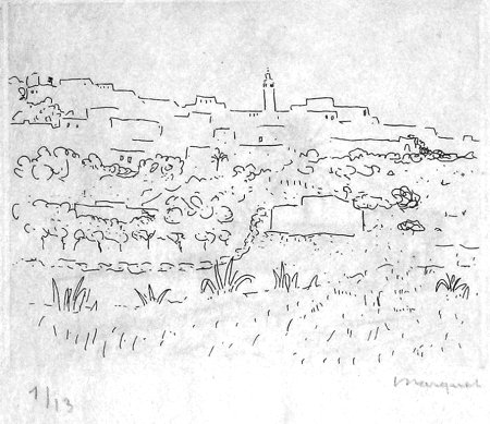 48. MARTY (Marcelle). Images d'une petite ville arabe. Gravures originales de Albert MARQUET. Paris, Brucker, s.d., (1947), in-4°, en feuilles sous couverture illustrée, chemise et étui ![]() 1000 € 1 des 20 (annoncé au justificatif) premiers exemplaires enrichis d'une suite sur Japon nacré signée par Marquet justifiée 1/13 26 gravures originales de Marquet