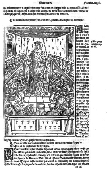 14 BOUCHARD (Alain). Les Croniques Annalles des pays dangleterre et bretaigne. Contenant les faictz et gestes des roys et princes qui ont regne audit pays, et choses dignes de memoire advenues durant leurs regnes puis Brutus jusques au trepas du feu duc de Bretaigne Francoys Second du nom dernier decede. Faictes et redigees par noble homme et sage maistre Alain Bouchard en son vivant, advocat en la court de parlement, et depuis augmentees et continuees jusques en Lan Mil cinq cens XXXI. Paris, Jehan Petit, 1531. In-folio, veau fauve, décor à la Du Seuil, dos orné, tranches mouchetées (Reliure de l'époque). 10 000 / 12 000 ![]() Troisième édition, considérée comme la meilleure, illustrée de 9 grands bois gravés. Alain Bouchard était avocat au parlement de Bretagne et maître des requêtes du duc François II. Il fut employé par la duchesse Anne de Bretagne et en 1485, il écrivit la première histoire de Bretagne en français. Cette édition divisée en quatre livres, précédés de 10 feuillets liminaires, composés du titre (en noir et rouge), encadré du portique de Galliot du Pré, au verso du titre, la liste des noms des rois bretons de la Grande Bretagne et 9 feuillets de table. LE PLUS BEAU LIVRE ILLUSTRÉ SUR LA BRETAGNE PUBLIÉ AU XVIe SIÈCLE. L'illustration de cette édition, excepté le titre frontispice, consiste en la reproduction de neuf gravures sur bois sur les douze de l'édition de 1514. Trois gravures sont répétées. Elles représentent des scènes de bataille, des saints bretons, les écussons de Bretagne, etc. On a joint une carte tirée du Théâtre Françoys de Maurice Bouguereau intitulée Description du Pays Armorique a près Bretaigne. Dos et plats fortement restaurés, page de titre restaurée sans manque de texte, carte doublée présentant une importante restauration, quelques trous de vers.