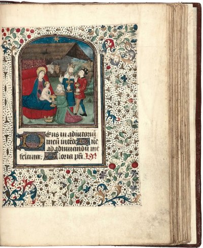 77 [MANUSCRIT] - HEURES À L'USAGE DE BESANÇON. Besançon, Vers 1450. 20 000 / 30 000 ![]() Parchemin. 111 ff. 230 x 172/75 mm (justification : 107 x 77 mm). 15 longues lignes par page ; réglure à l'encre rouge. La piqûre est visible. Composition. 18 (f. 1-8), 25(4 + 1) un feuillet blanc a été ajouté entre le calendrier et le début des Heures (f. 9-13), 38 - 148 (f. 14-109), 152 (f. 110-111). Réclames. Placé dans une reliure italienne du 17e siècle à compartiments dessinés par un listel noir et ornés de petits fers, dos modernes. LE CONTENU. En latin et en français (notamment les rubriques). - f. 1-12v° : Calendrier discontinu, en français. f. 13 : blanc. - f. 14-57 : Heures de la Vierge, à l'usage de Besançon : Matine (f. 14-23v°), laudes (f. 24-34), prime (f. 34v°-38), tierce (f. 38v°-41v°), sexte (f. 42-45), none (f. 45v°-47v°), vêpres (f. 48-52v°), complie (f. 53-57). - f. 57v°-60v° : Heures de la Croix. - f. 61-65 : Heures du Saint Esprit. - f. 65v°-83v° : Psaumes de la pénitence, avec litanies (f. 77-82v°). - f. 84-92v° : Office des morts, à l'usage de Besançon (3 leçons). - f. 93 : Evangile de saint Jean. - f. 94 : Sensuiguent (sic) les sept vers de saint Barnard. - f. 96v° : Oroyson de nostre dame : Salue mate< r > dolorosa. - f. 98v° : Oroyson a Marie Magdelene : O Marie Magdelene qui deuant Dieu plora. - f. 99 : Oroyson de nostre dame. Obsecro te(pour un homme). - f. 102v° : Oroyson de nostre dame : O intemerata(pour un homme). - f. 105 : Oroyson moult belle a Iesu Crist. Aue salus mundi uerbum patris. - f. 106 : Oroyson de nostre dame. Virgo dulcis virgo pia / Dei mater o Maria. - f. 106v° : Oroyson de la crois. Crucem tuam adoramus et veneramur. - f. 107v° : Oroyson. Ave sanctissimum preciosissimum omnipotens et misericors corpus Domini. - f. 108 : Oroyson. Anima Christi sanctifica me. - f. 108v° : Oroyson de saint Christofle. Glorieux saint de grant valeur. - f. 109 : Oroyson de saint Claude. O desolator consolator captivorum liberator(la fin manque). - f. 110 : [De saint Sebastien (le début manque).] Oroyson. Omnipotens sempiterne Deus, qui precibus et meritis beati Sebastiani martiris. - f. 110 : De saint Anthoine. Vox de celo Anthonium facta est Oratio. Deus qui nos concedis obtentu beati Anthoni - f. 111 : (texte barré, sans rubrique, ni initiale). LA LITURGIE est celle de Besançon. On verra la place importante de saint Ferréol et saint Ferjeux (ou Fargeau) : 30 mai, translation des deux saints ; 16 juin (en rouge), fête inscrite ce jour au martyrologe de Bède ; 5 septembre (en rouge), invention de deux saints, au jour où ils sont fêtés au martyrologe hiéronymien (comme dans l'archidiocèse de Besançon). Ces saints sont les patrons principaux de la ville, les patrons secondaires de l'archidiocèse. On relève aussi la dédicace de s. Estienne [cathédrale de Besançon] (10 octobre), et les saints Claude, év. de Besançon (6 juin), Antide, év. de Besançon (en rouge, le 17 juin), Désiré, év. de Besançon (27 juillet), Donat, év. de Besançon (7 août), Germain, év. de Besançon (11 octobre) et Renebert (24 octobre) Les litanies présentent aussi quelques séquences intéressantes. Parmi des disciples : Étienne, Agapite, Ferréol, Ferjeux, Epyphane, Ysidore, Germain, Antide Puis : Vincent, Nazaire, Léger, Lazare, Mammès, Gengulphe, Cimphorien, Hyrénée (sic) et ses compagnons, Julien et ses compagnons, Quintin. Parmi les martyrs : Martin, Désiré, Donat, Ysidore Nicholas, Alexis, Augustin , Claude, Brigitte. - Parmi les suffrages, se trouve à nouveau Claude. LA PEINTURE. 11 grandes peintures décorent ce manuscrit. Elles sont l'uvre d'un artiste local assez habile. Sa palette n'est pas richesse ; le rouge, les bleus et les verts y dominent, mais on y trouve aussi des gris et des noirs de belle qualité. Son programme iconographique n'est guère originale, mais la Nativitén'est pas sans rapports avec celle du manuscrit de New York, Pierpont Morgan Library, M. 28, f. 50 (Cf. Plummer, The Last Flowering, op. cit., p. 57-58, et pl. 75b). Le lit rouge, devant un fond orné de rinceaux, l'âne et le buf, Joseph une bougie dans la main droite, un bâton dans la gauche : tout cela renvoie à la Nativitédu ms Morgan. L'Adoration des mages. New York/Londres, 1982. CE MANUSCRIT EST D'ORIGINE PROVINCIALE, MAIS L'AMPLEUR DE SES MARGES LUI CONFÈRE UNE GRANDE ELÉGANCE. Lot présenté par la Société Rossini