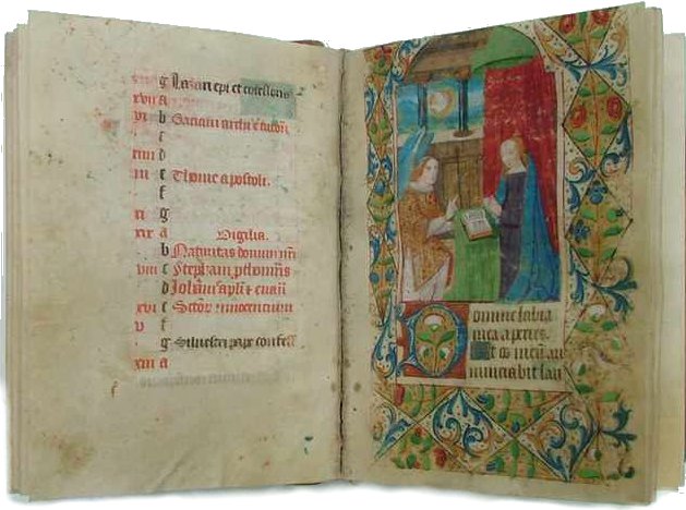 N° : 847 - LIVRE D'HEURES A L'USAGE DE BOURGES. Lyon . [1485-1500]. Parchemin, 1 parchemin + 108 ff. (12+ 96 + 11bis, 47 oublié) + 2 parchemin + 1 papier, 190 x 147 mm. , écriture textura à l?encre brune et rouge, 17 longues lignes pour le texte et le calendrier, justification 129 x 78 mm. pour le texte et 130 x 73 mm pour le calendrier, réglure à l'encre rouge, réclames aux ff. 8v, 15v, 31v, 54v, 62v, 70v, 78v, 86v , lacune entre les ff. 32v et 33, les ff. 38v, 44 à 45v sont blancs, f. 93 rogné dans le bas. Reliure du XVIIe siécle en veau avec un dos orné de motifs floraux en or. Charmant manuscrit enluminé à Lyon par le Maître des entrées actif de 1485 à 1519 Est : 12000/14000 |