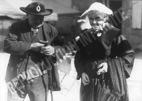 18 / 905 - Couple d'un certain âge, elle portant le capot replié sur le bras gauche, lui consultant son oignon et arborant une broche à son chapeau. 120/150 e Résultat : 100 |