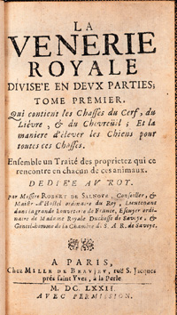 210 - REILLE (Karl). La Vénerie française contemporaine. Paris, Adolphe Le Goupy, 1914. Fort volume in-4°, bradel, cartonnage entoilé vert, large massacre et tête en relief ornant le premier plat (reliure de l'époque). Nombreuses illustrations en couleurs et en bistre. Tiré à 600 exemplaires sur vélin, celui-ci n° SHU, exemplaire nominatif du baron Despatys comportant une aquarelle originale signée sous la justification. Ex-libris Sosthène Hadengue. « Ce beau volume est extrêmement recherché aujourdhui et devient de plus en plus rare » (Thiébaud, 772). est : 15 000/20 000 Résultat : 51.000, 211 - SAINT-AULAIRE (A. de). Chronique de la forêt de Sauvagnac. Paris, Calmann-Lévy, 1899. In-12, bradel, demi-toile bleue, dos orné, armes en pied (reliure de lépoque). De la bibliothèque dAimé Mottin, avec ex-libris et armoiries au dos. Thiébaud, 799. est : 300/400 Résultat : 800, 212 - SALNOVE (Robert de). La Vénerie royale, divisée en IV parties ; qui contiennent les chasses du cerf, du lievre, du chevreüil, du sanglier, du loup, & du renard. Avec le dénombrement des forests & grands buissons de France [ ]. Paris, Antoine de Sommaville (et André Soubron), 1655. 4 parties en un volume in-4°, maroquin rouge, triple filet doré encadrant les plats, dos à nerfs orné, dentelle intérieure, tranches dorées (Chambolle-Duru). Un titre-frontispice gravé sur cuivre. BEL EXEMPLAIRE DE LÉdition originale de ce CÉLÈBRE TRAITÉ qui remplaça celui de Du Fouilloux (lequel ne fut plus réimprimé en France entre 1650 et 1844.) Thiébaud, 823. est : 4 000/5 000 Résultat : 32.000, 213 - SALNOVE (Robert de). La Vénerie royale, divisée en IV parties ; qui contiennent les chasses du cerf, du lievre, du chevreüil, du sanglier, du loup, & du renard. Avec le dénombrement des forests & grands buissons de France [ ]. Paris, Antoine de Sommaville, 1665. 4 parties en un volume in-4°, veau, dos à nerfs orné (reliure de lépoque). Un titre-frontispice gravé sur cuivre. Seconde édition dont la deuxième partie est dédiée au duc de Savoie, la première l'étant au roi Louis XIV. « Cette seconde édition est [ ] la réimpression exacte de lédition de 1655 ; elle est toutefois mieux imprimée que la première, sur meilleur papier et dun format un peu plus grand » (Thiébaud, 824). Manque à la coiffe de tête ; mouillure ancienne en bas de page. est : 2 000/3 000 Résultat : 7.800,