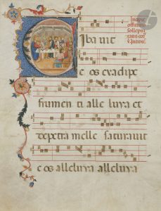 N° 13·INITIALE « C » historiée. La Cène.. Feuillet extrait d’un graduel . Tempera, gouache et …