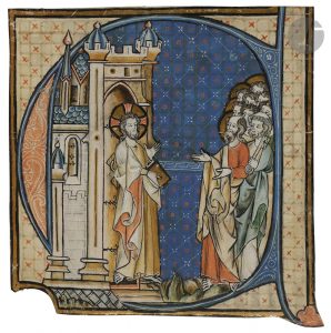 N° 31·INITIALE « E » historiée. Christ accueillant les apôtres devant la Jérusalem céleste (?). …