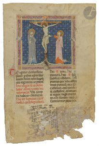 N° 7·MINIATURE Crucifixion. . Feuillet extrait d’un missel. Tempera, gouache, et or liquide sur …