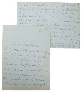 Charles LECONTE de LISLE (1818-1894) Ecrivain. Manuscrit de cinq poèmes autographes signés. Marcel PROUST (1871-1922) Ecrivain. Lettre autographe signé mois de juin 1919 à Madame Catusse. Donatien Alphonse François de SADE, dit le Marquis de Sade (1740-1814) Lettre autographe adressée en 1767 à son oncle, l’Abbé Jean François de Sade. STENDHAL, Henri Beyle dit (1783-1842) Testament autographe signé adressé de Paris, à son cousin Romain Colomb. Paul VERLAINE (1844-1896) Lettre autographe signée adressée à son ami Irénée Decroix. Charles BAUDELAIRE. Les Fleurs du Mal. Paris, Poulet-Malassis et de Broise, 1857, in-12. Edition originale, Exemplaire offert par Baudelaire à l’écrivain Paul de Molènes, portant la dédicace « à M. Paul de Molènes..... Ch. Baudelaire. ». MUCHA. Le Pater. Commentaire et compositions de A. M. Mucha. Paris, Piazza, 1899.