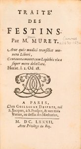 N° 307·* MURET (Jean). Traité des festins. À Paris, chez G. Desprez, 1682. In-12, [9] f., 230 p., [12] …