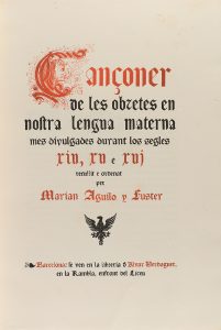 N° 37·.1873-1900.. LIBRO: .(BIBLIOFILIA).. .AGUILO Y FUSTER, MARIAN:. .CANÇONER DE LES OBRETES EN NOSTRA …
