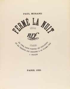 N° 39·1925. LIVRE : (BIBLIOPHILIE). MORAND, PAUL ; PASCIN, J.(Illustr.) : FERMÉ LA NUIT. Paris : Imp. …