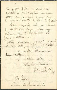 N° 5·Hector BERLIOZ. — L.A.S., Paris 30 juin [1862], au violoniste Henry Vieuxtemps ; 2 pages in-8 …