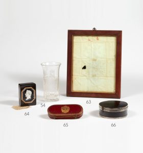 N° 63·Cadre reliquaire double-face, contenant cinq cheveux de l'Empereur Napoléon 1er, fixés sur une …