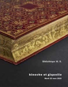 BINOCHE & GIQUELLO - BIBLIOTHÈQUE M. D. : LIVRES PRÉCIEUX - RELIURES. MARDI 22 MARS 2022 À 14H00 - DROUOT Salle 2. Vous pouvez enchérir par ordres d’achat ou enchères téléphoniques en envoyant directement votre demande d’ordre d’achat ou votre réservation de ligne à l’étude avant le MARDI 22 mars à 12h00 Tel. : . +33 (0) 1 47 70 48 90 ou DROUOT LIVE vous pouvez donc enchérir sur la plateformes (+1,8 % HT). AVEC INSCRIPTION AVANT LE MARDI 22 à 12H00