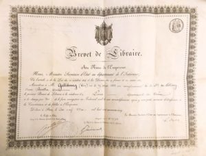 N° 15·LIBRAIRIE / Brevet de Libraire en résidence à Paris, sur vélin (45 x 35 cm) avec vignette …