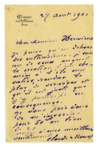 N° 32·MONET Claude, Lettera autografa firmata. Datata 27 agosto 1901.