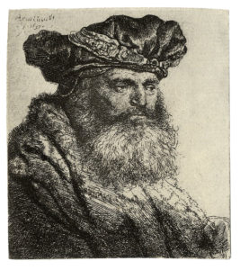 N° 116·Rembrandt Harmenszoon van Rijn, Uomo con barba e cappello di velluto con una chiusura gioiello. …