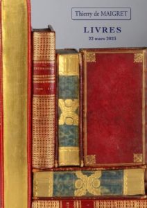 Thierry de MAIGRET s.v.v. Paris. LIVRES et MANUSCRITS. AUTOGRAPHES. MERCREDI 22 MARS 2023 à 11h00 (lots 1 à 62) et 13h30 (63 à 458). Drouot salle 1. Vous pouvez donc enchérir par ordres d’achat ou enchères téléphoniques en envoyant directement votre demande d’ordre d’achat ou votre réservation de ligne à l’étude. Tel : 33 (0) 1 44 83 95 20 - Drouot salle 1. Vous pouvez enchérir - En live, sur la plateformes Drouot Live (+1,8 % HT). Avec INSCRIPTION AVANT LE MARDI 21 MARS à 18h00