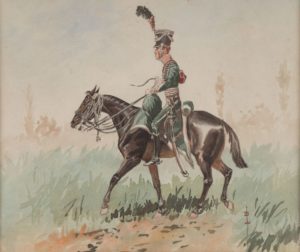 N° 828·ECOLE FRANCAISE - Chasseur à cheval. (XIXème siècle). Aquarelle. 17.5 x 21 cm. Cadre moderne. …
