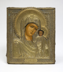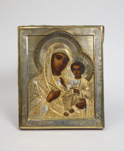 N° 12·Icône « Vierge de Kazan » Russie, XIXe siècle Tempera sur bois. Oklad en laiton repoussé 45 х …