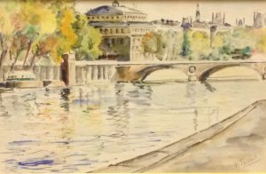N° 672·THEVENET (Pierre). "Pont au Change, Paris" (1929). Aquarelle avec repères à la mine de plomb, …