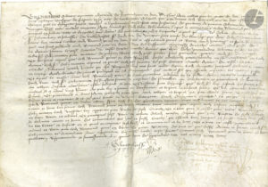 N° 352·BRETAGNE. Charte, [Tréguier] 4 septembre 1502 ; parchemin, 30 x 39 cm (petit trou). Prise de …