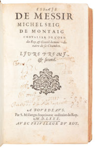 N° 102·MONTAIGNE. Essais. Bordeaux, Simon Millanges, 1580. In-8, vélin rigide, restes de lacets, mention …
