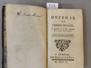 N° 115·[MONTESQUIEU]. Défense de l'Esprit des loix [...]. A Geneve, Chez Barrillot & Fils, 1750. In-12, …