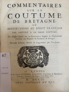 N° 67·[BRETAGNE]. La BIGOTIÈRE (René de). Commentaires sur la Coutume de Bretagne, ou institutions au …