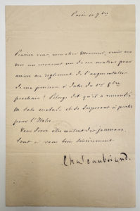 N° 30·CHATEAUBRIAND François René Comte de : Lettre autographe signée. Il demande à son interlocuteur …