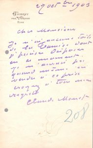 N° 121·Claude MONET. L.A.S., Giverny 27 octobre 1903, [au marchand de tableaux Lucien Moline] ; 1 page …