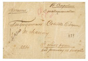 N° 64·[LÉNINE]. ENVELOPPE SECRÈTE MANUSCRITE COMPORTANT LA SIGNATURE DE LÉNINE. 1918. 13,5 x 19,4 cm.