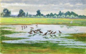 N° 7·Oberthür (Joseph). Mouettes et petits échassiers. Gouache originale; 23 x 15 cm.