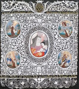 N° 14·Canivet. 18e s. 27 x 23,5 cm, papier, avec 5 médaillons aquarellés et du texte découpé. Posé …