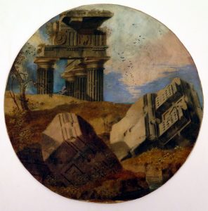 N° 489·[Paysages avec ruines], XIXe s. 4 aquarelles, vergé fort, 3 rondes, diam. 29,2 cm, 1 ovale, 33 x …