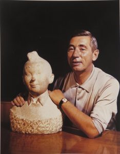 N° 606·Hergé posant avec le buste de Tintin, 1964. Photogr. orig. en couleurs tirée sur Cibachrome, 30,2 …