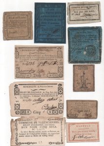 N° 21·[Révolution française] Rare lot de 21 billets de confiance, patriotiques ou bons communaux. 3 s., …