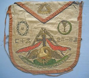 N° 59·[Tablier] 2 tabliers de Chevalier Rose-Croix en en soie, velours, fil doré et broderie au petit …