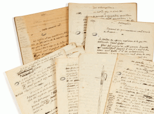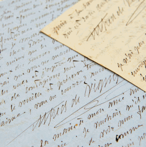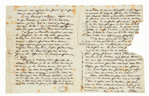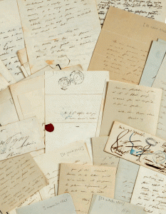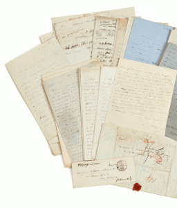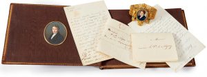 Alfred de VIGNY (1797-1863), poète, romancier et auteur dramatique fut l’une des figures les plus marquantes du romantisme en France. La collection provient des héritiers de la légataire univers elle d’Alfred de VIGNY qui était la fille de Virginie ANCELOT (1792- 1875), écrivain et peintre. La correspondance, très abondante, évoque les liens qui unissaient l’homme de lettres à Adèle et Victor HUGO dont il était très proche, mais aussi à Marie d’AGOULT, Hans Christian ANDERSEN, Honoré de BALZAC, Jules BARBEY d’AUREVILLY, Hector BERLIOZ, Auguste BRIZEUX, François BULOZ, Marceline DESBORDES-VALMORE, Marie DORVAL, Alexandre DUMAS, Delphine de GIRARDIN, Alphonse de LAMARTINE, Adam MICKIEWICZ, Alfred d’ORSAY, Franz LISZT ou Charles-Augustin SAINTE-BEUVE, Abel-François VILLEMAIN… Suivent de très nombreux manuscrits littéraires – brouillons et manuscrits originaux de poèmes, dont celui de La Mort du Loup, de fragments d’œuvres, ainsi que des documents divers, éclairant notamment la vie quotidienne de VIGNY dont une correspondance avec son épouse Lydia. Un album de photos inédites de Gustave LE GRAY, une lettre autographe signée de Thomas JEFFERSON, des dessins de Tony JOHANNOT d’Eugène DELACROIX, des tableaux et quelques pièces de mobilier complètent cet ensemble.