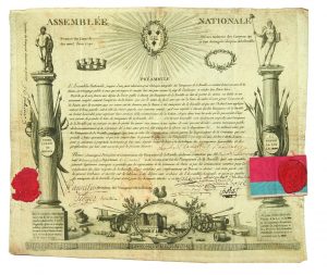 Six lots ont été préemptés par l’Assemblée Nationale : Le lot 41 (Brevet de vainqueur de la Bastille)  à 2.318 €, – Le lot 60 (Recueil des actions héroïques et critiques des républicains français) à 188 €,. Le lot 71 (Lettre autographe signée ‘Cambon fil aîné’) à 837  €,. Le lot 211 (MIRABEAU L’Ami des Hommes, ou Traite de la population) à 226 €,. Le lot 286 (RAVAILLAC Manuscrit) à 3.864 €,. Le lot 314 (SIEYES Préliminaire de la Constitution) à 1.379 €.